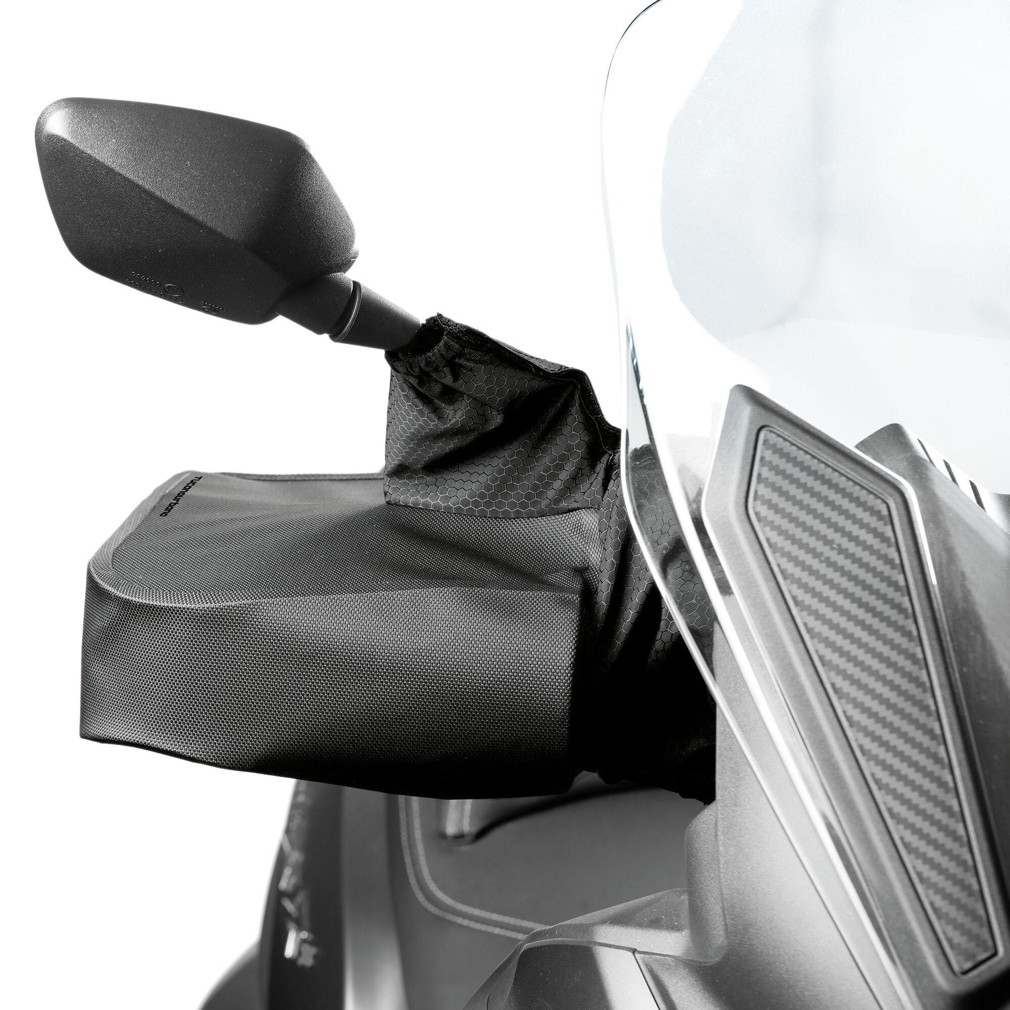 Gloves for handlebars with mirrors, both with and without counterweights. Compatible with most handlebars, both with and without counterweights.