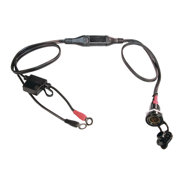 DIN socket for motorcycle of the Optimate brand in the O-08 model with plastic chassis and sealed plug, includes permanent battery cable and in-line seals for high-resistance SAE connectors