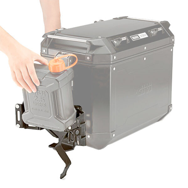 Your Givi Outback, Dolomiti and Alaska cases have many accessories, one of them is the removable E205 support for small TAN01 gasoline cans that is mounted on the back of the case.