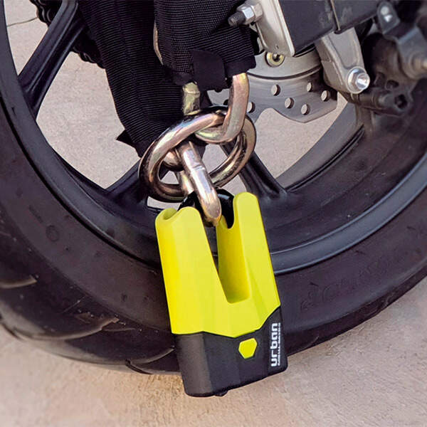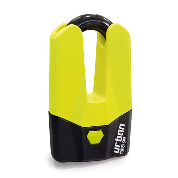 Urban Mini U disc lock in fluor yellow. It can be placed on the front brake disc, on the rear wheel chain or anchored to an external element.