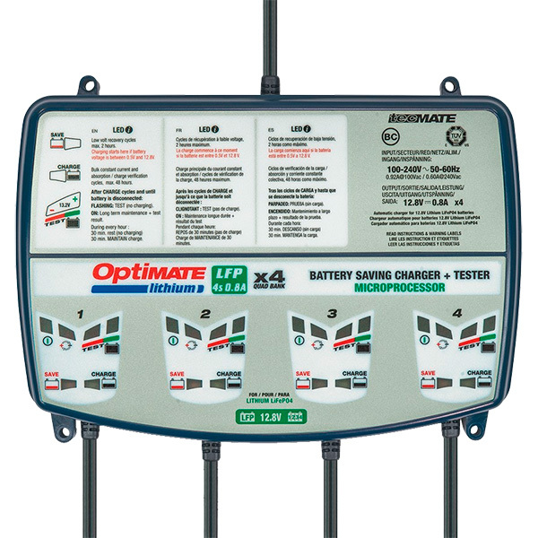 Optimate TM-484 battery charger perfect for use on high displacement motorcycles and Quad All Terrains ideal for 4x 12.8V/13.2V LiFeP04 / LFP batteries