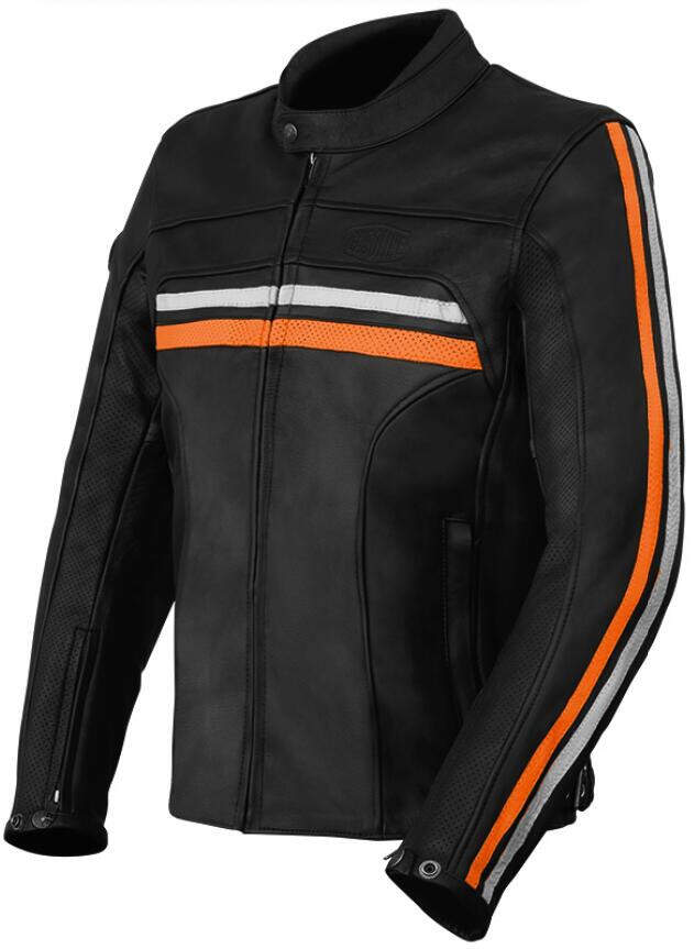 Black leather jacket with two white/orange stripes, Enfield model for men, a very vintage style for this leather jacket. Ref. VESTENFM3
